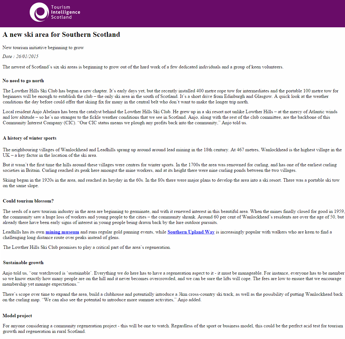 "Exciting times are ahead for Scotland's newest ski area!, published Snowsport Scotland, the national governing body for snowsports in Scotland, which also praised Lowther Hills for having the highest ratio of participation in snowsports in any community across Scotland: