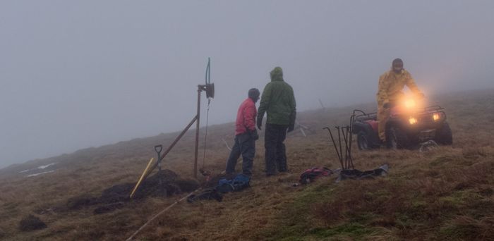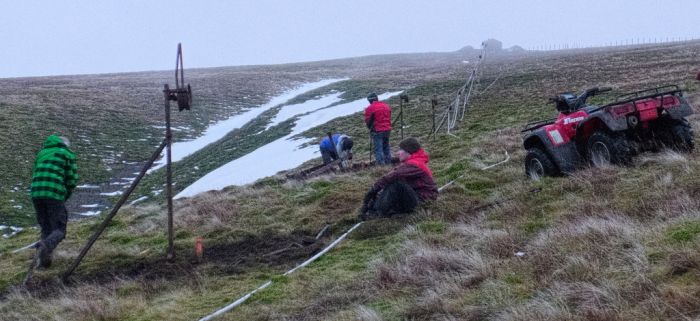 Wednesday 17th December. Cold, wet and windy day, it felt pretty miserable at times. While Chris ferried the last of the repaired pylons up the hill, Ross, Bruce and Anjo dug in a further four. Just a half dozen to go now. Photo by Ross Dolder.